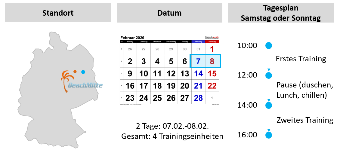 Dieses Februar-Wochenende (07.02.-08.02.) erleben Sie intensives Beachvolleyball-Training für Fortgeschrittene im Herzen von Berlin. Unser Wochenend-Camp am berühmten Beach Mitte bietet individuell abgestimmtes Training in zwei kleinen Gruppen. Mit zwei Einheiten pro Tag decken wir alle wichtigen Spieltechniken ab.