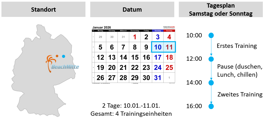 Im ersten Januar Camp (10.01.-11.01.) erleben Sie intensives Beachvolleyball-Training im Herzen von Berlin. Unser Wochenend-Camp am berühmten Beach Mitte bietet individuell abgestimmtes Training in zwei kleinen Gruppen. Mit zwei Einheiten pro Tag decken wir alle wichtigen Spieltechniken ab.