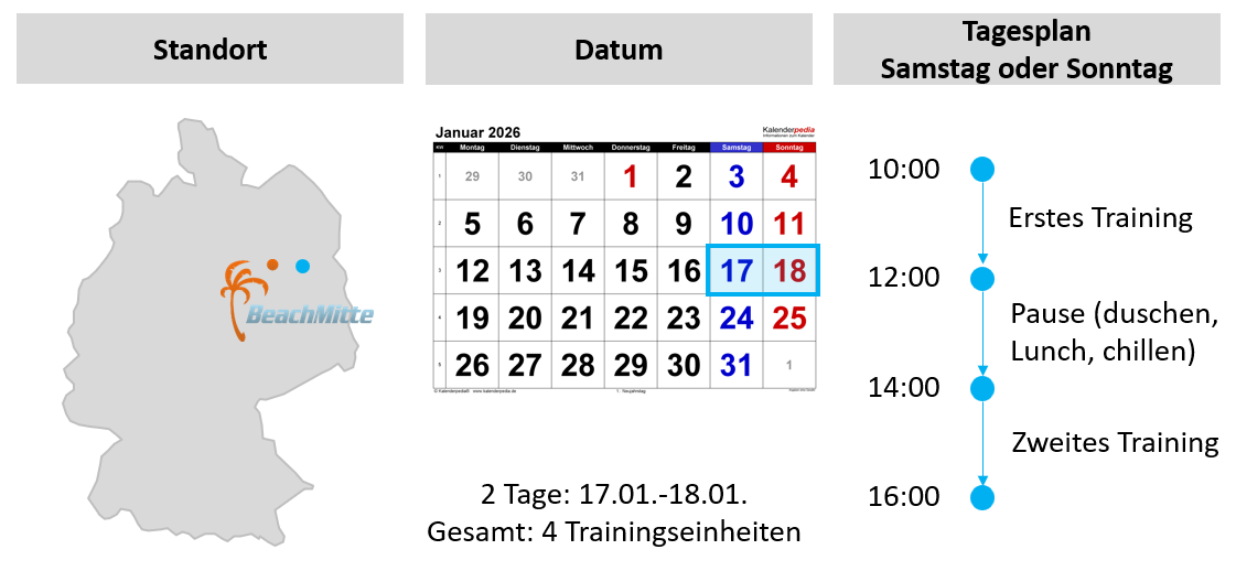 Im ersten Januar Camp (17.01.-18.01.) erleben Sie intensives Beachvolleyball-Training im Herzen von Berlin. Unser Wochenend-Camp am berühmten Beach Mitte bietet individuell abgestimmtes Training in zwei kleinen Gruppen. Mit zwei Einheiten pro Tag decken wir alle wichtigen Spieltechniken ab.