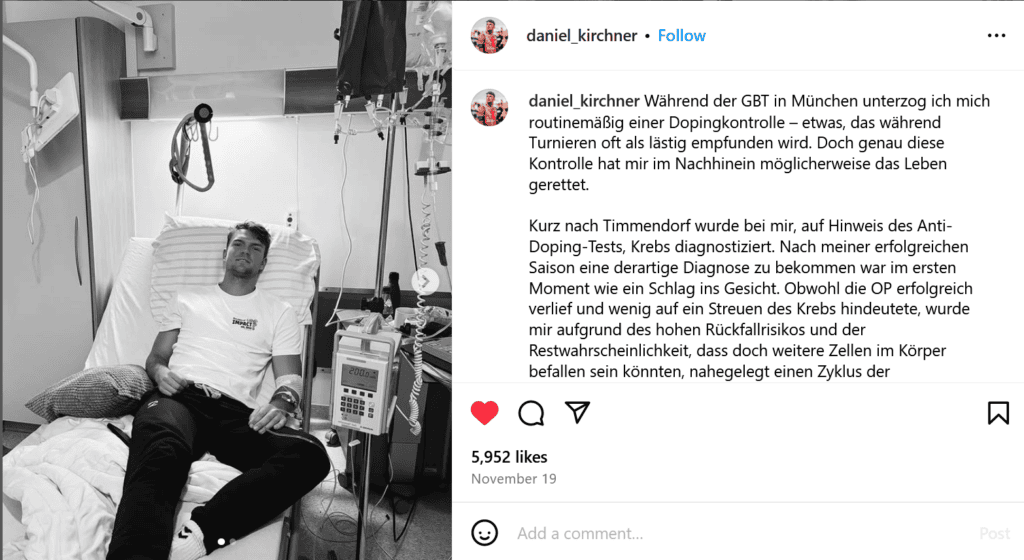 During a routine doping test, Daniel Kirchner, a rising German beach volleyball player, was diagnosed with a serious illness. This diagnosis enabled early treatment and ultimately saved his life.