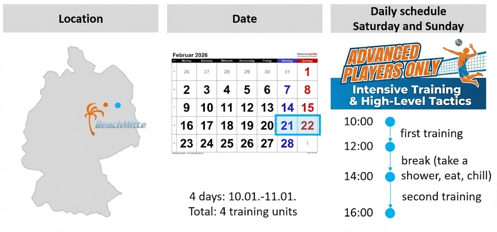 This February weekend (14.02.-15.02..) experience intense beach volleyball training in the heart of Berlin. Our weekend camp at the famous Beach Mitte offers individually tailored training in two small groups. With two sessions each day, we cover all essential game techniques.