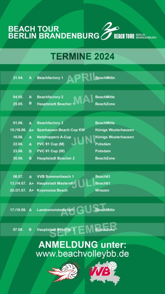 Du bist herzlich eingeladen, Teil der aufregenden Serie halbprofessioneller Beachvolleyball-Turniere zu werden, die in Berlin und der näheren Umgebung stattfinden. Die unten genannte Turnierserie bietet eine fantastische Gelegenheit für aufstrebende und erfahrene Spieler, ihr Können in einer konkurrenzfähigen und dynamischen Umgebung unter Beweis zu stellen. Die Turniere bieten auch für interessierte Zuschauen eine schöne Möglichkeit diese wunderschöne Sportart live und kostenfrei zu erleben.